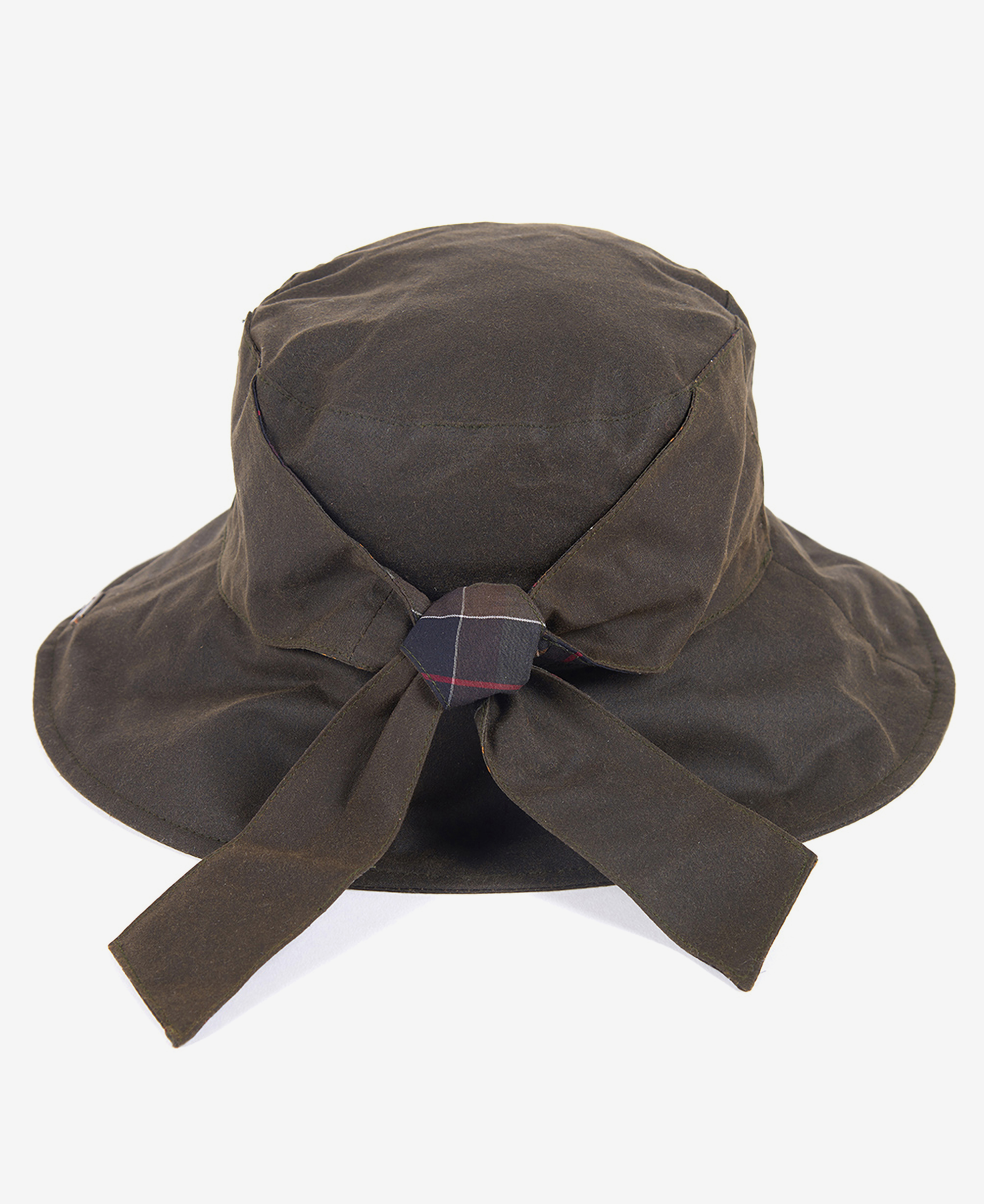 Cette version féminine d'un chapeau d'inspiration campagnarde est fabriquée en coton ciré et comporte un ruban à nouer garni de tartan Barbour. Doublé de coton respirant, ce chapeau souple est conçu pour être pliable, ce qui le rend idéal pour être glissé dans une poche.