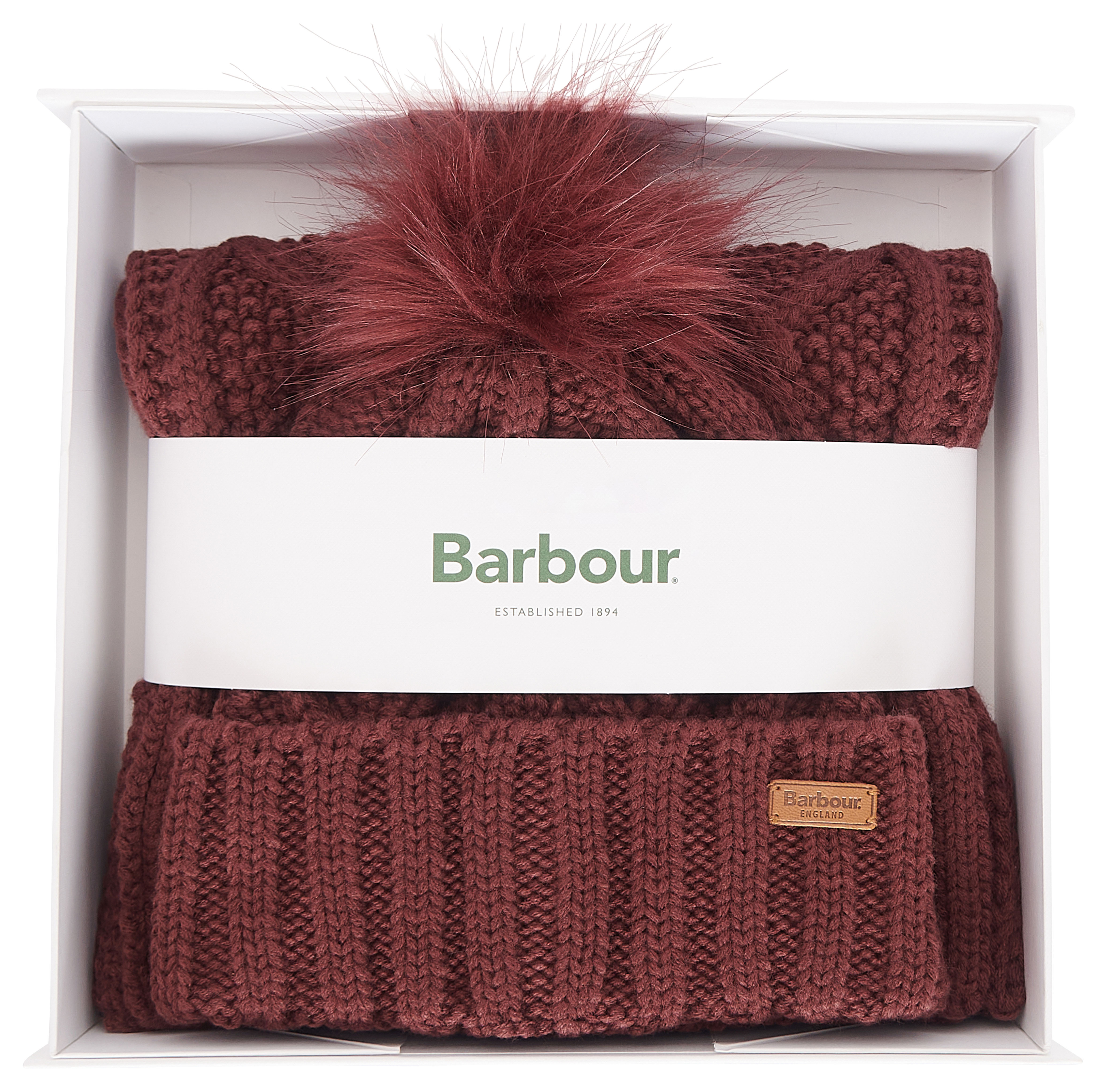 L'ensemble bonnet et écharpe Barbour Ridley comprend une écharpe et un bonnet tricotés avec un pompon en fausse fourrure et un ourlet retourné. Ce deux pièces est présenté sans effort dans un coffret cadeau de marque.