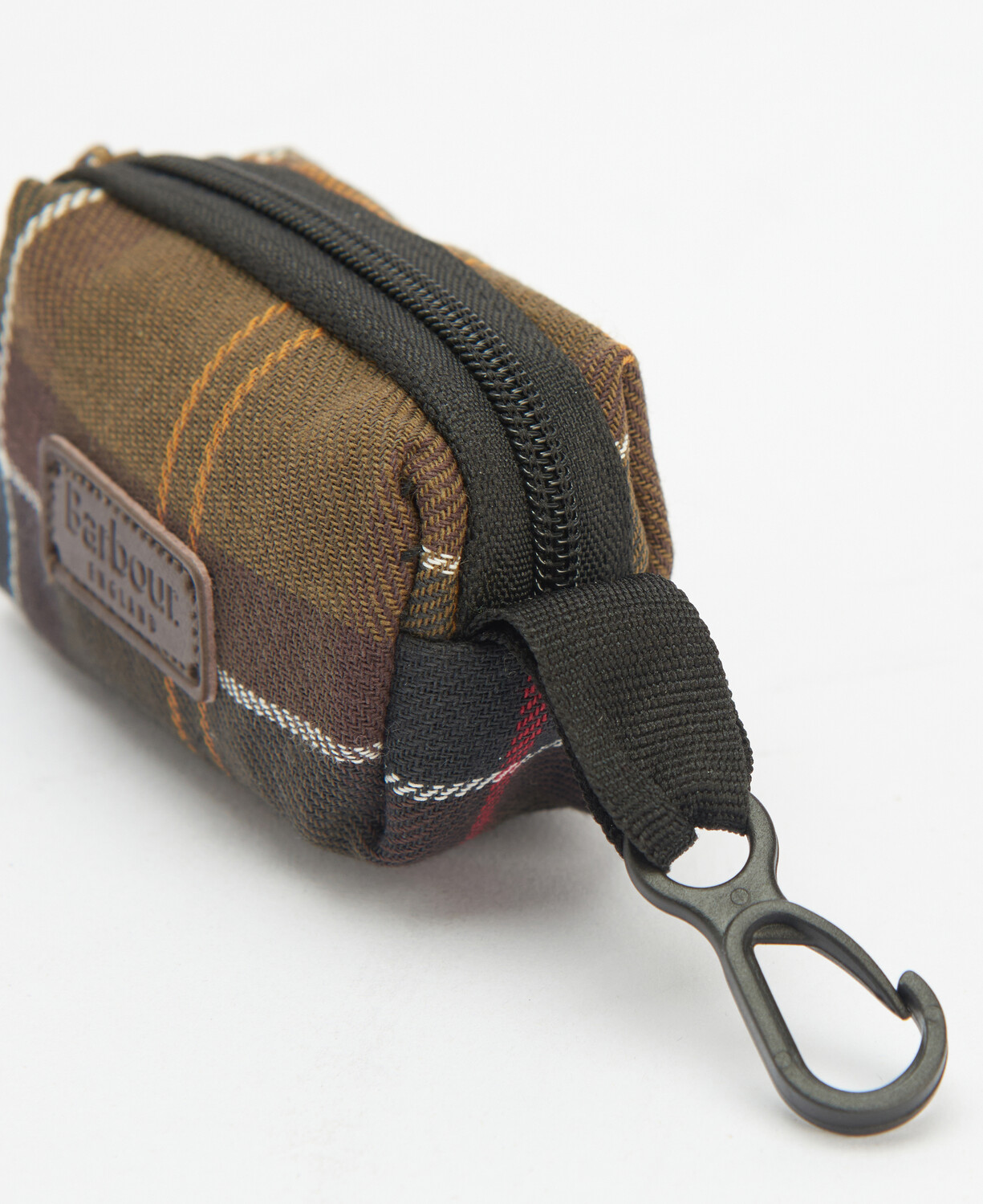 Distributeur de sacs à crottes Barbour en tartan classique avec fermeture zippée et badge de marque en cuir gaufré. Un clip en plastique durable permet d'attacher le distributeur à une laisse de chien Barbour.