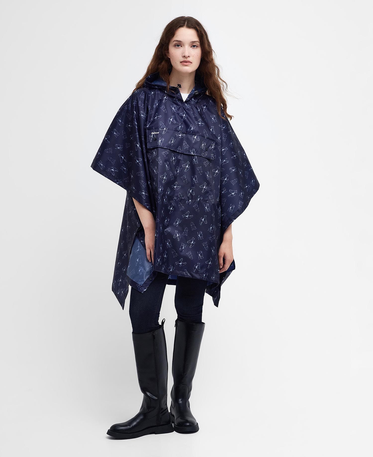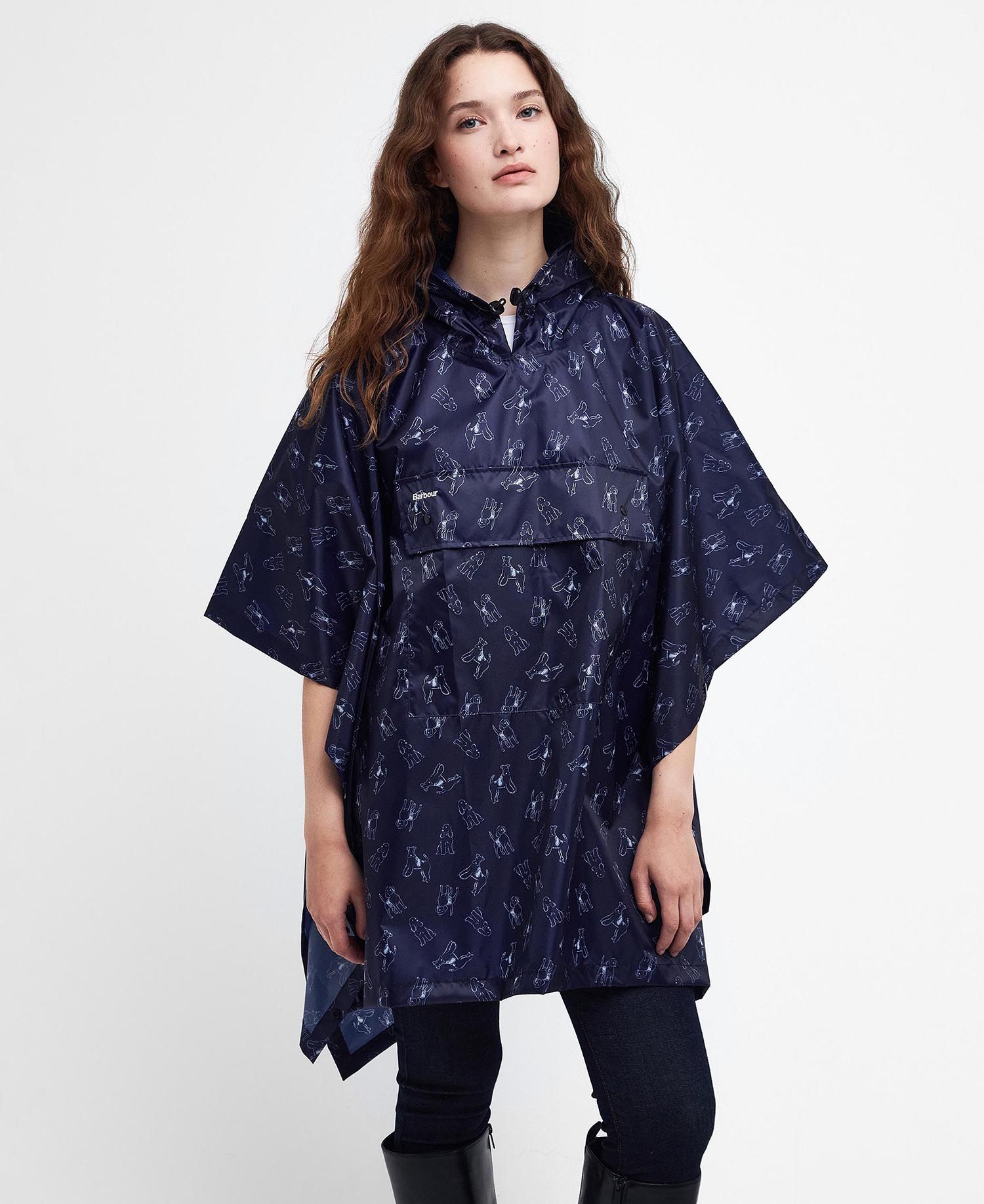 Assurez-vous d'être prêt à affronter les intempéries grâce à ce poncho imperméable à l'eau, qui peut être empaqueté et qui est orné de notre motif canin amusant. Doté d'une capuche pratique pour les temps imprévisibles, ce poncho est orné de la marque Barbour imprimée sur la poitrine.