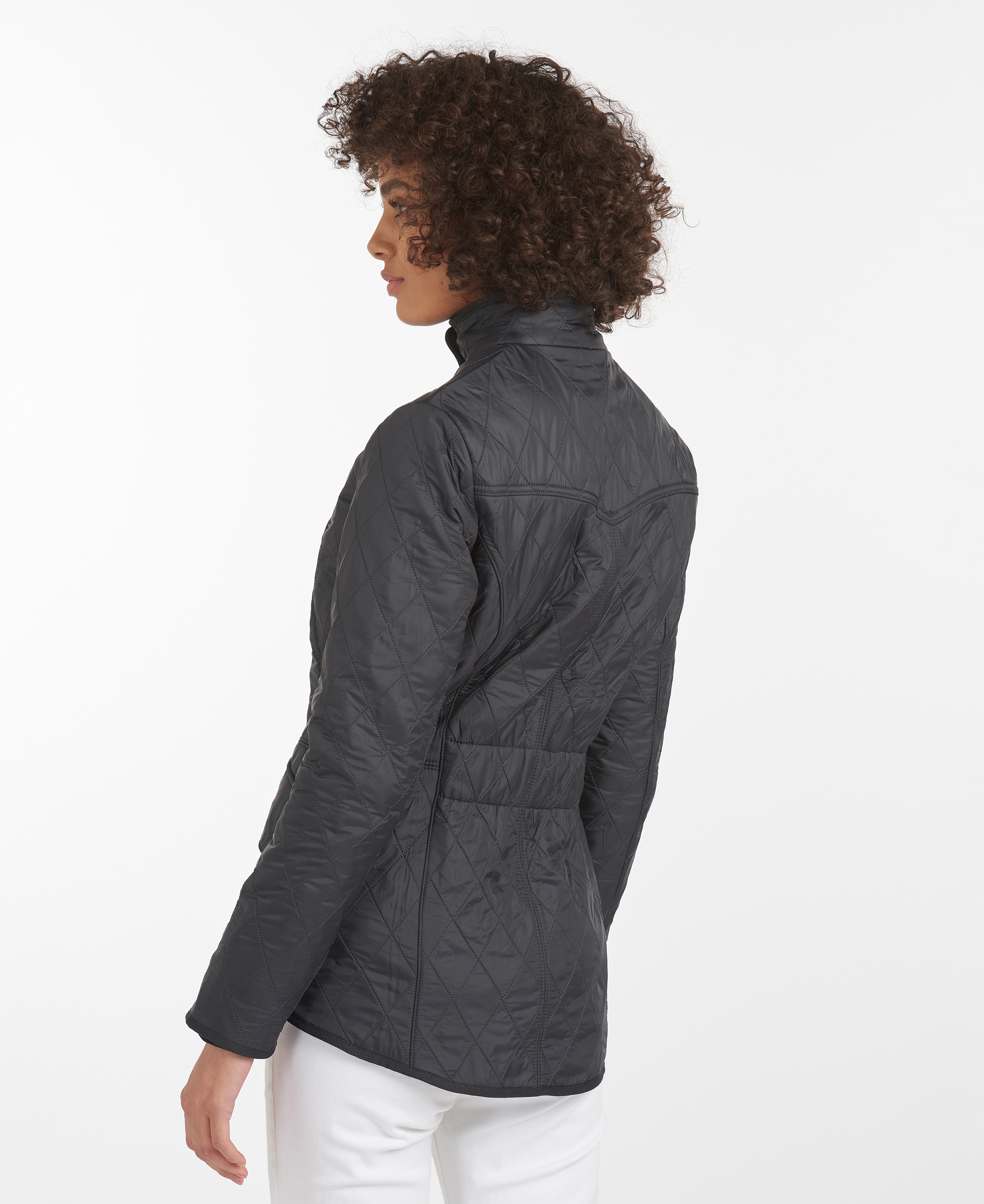 Cette veste inspirée de l'équitation est composée d'un extérieur matelassé de diamants et d'une doublure polaire. Un élastique à la taille assure un ajustement confortable et une silhouette élégante.