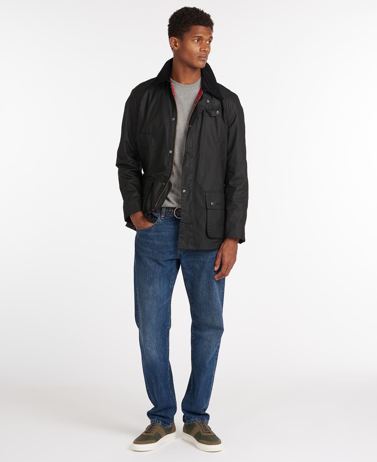 Avec une longueur de dos légèrement plus longue que l'emblématique Bedale, la veste huilé Ashby dispose également de poches intérieures et extérieures. Sa coupe est plus ajustée et le velours du col est plus fin.