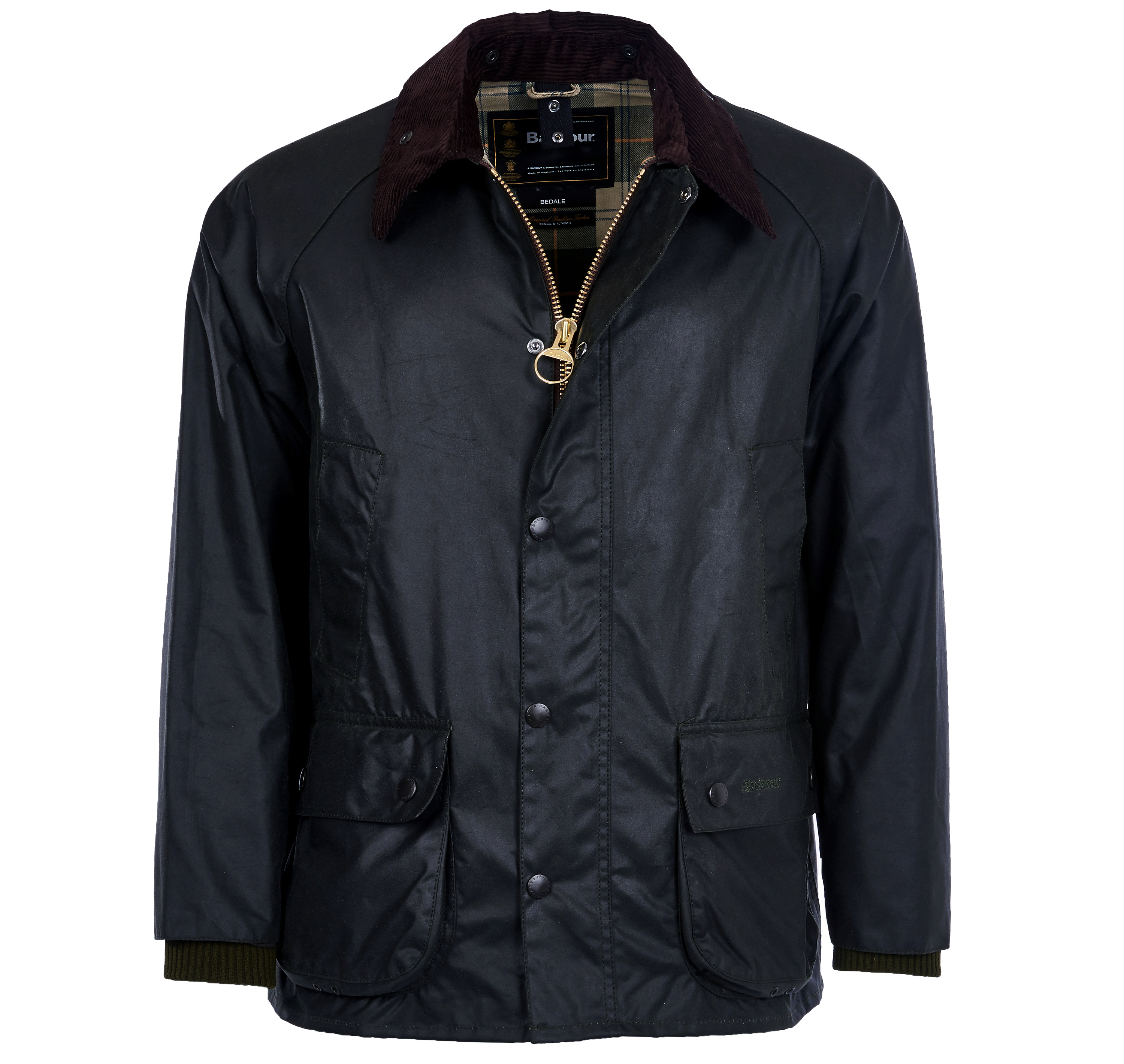 La veste huilée Bedale est dotée de deux grandes poches latérales à rabat, deux poches poitrine ainsi q'une poche intérieure. Le col classique de la Bedale est en velours et peut se fermer sous le menton à l'aide d'un rabat à pression. La doublure est en tartan classique de la marque Barbour.